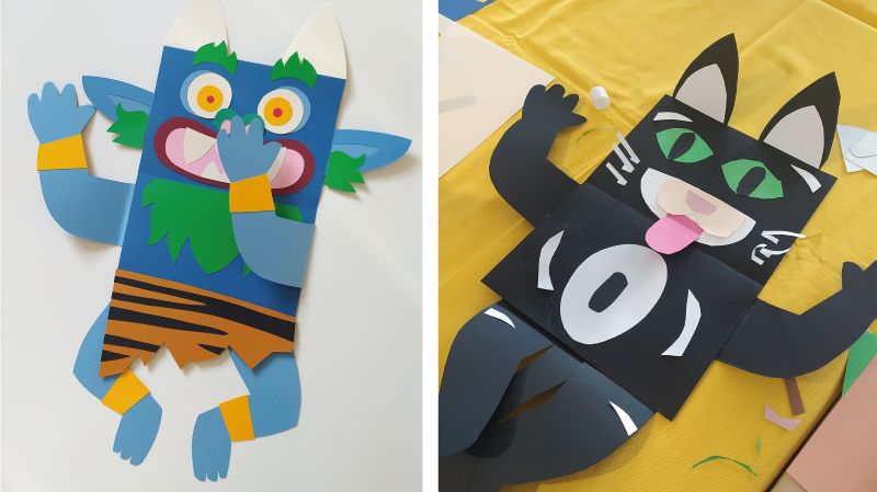L'illustratrice Amandine Momenceau propose de créer des personnages effrayants à partir de feuilles A4 pliées en deux. Autour de cet élément central - qui constitue la tête et le corps du monstre - on ajoute des pattes et divers éléments de personnalisation, comme des cornes, des griffes, une queue…